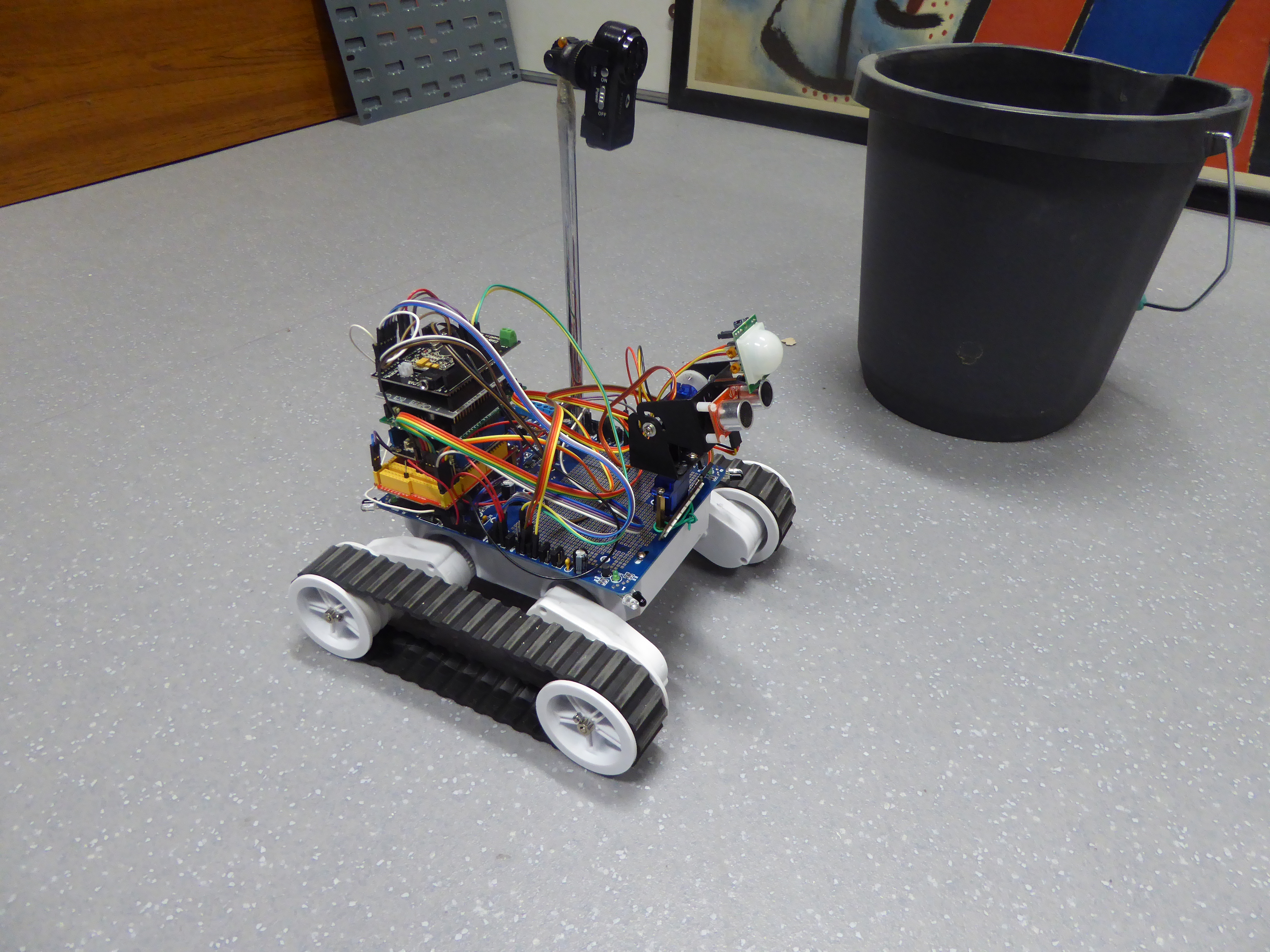 I started designing this platform in 2013. It has speech synthesis, rudimentary speech recognition (simple commands), an audio record/playback capability, a real time clock and a wifi interface. The robot has a head with two degrees of freedom. In addition there is closed loop odometry, infrared proximity sensors, an ultrasonic range finder and a passive IR (human) detector. The original concept was to design a small low cost robot that would roam autonomously, and be able to accept simple voice commands, access information via the internet and pursue both pre-defined, and user directed/prioritised goals. An 'intelligent pet' for £400, and no need to walk it or kennel it for vacations.