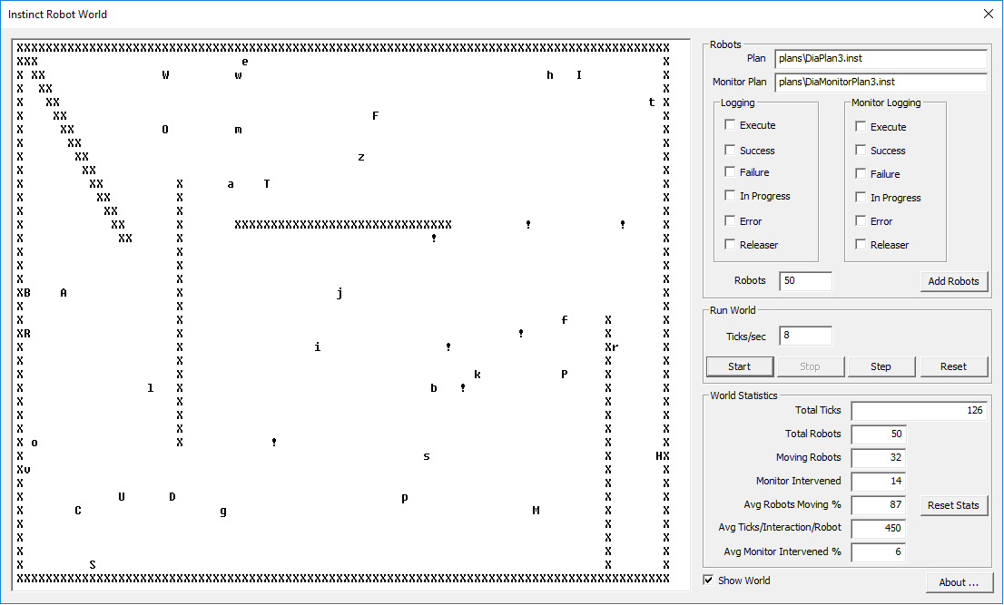 This is a simple graphical 2D world, in which multiple virtual robots, or agents, can operate. Originally designed as a test platform for the Instinct Planner, it has been enhanced to produce a useful simulation tool for Multi Agent System (MAS) simulations, and also as a means to exercise the Transparency feed mechanism within the Instinct Planner, without the necessity to deploy Instinct in a physical robot. This is proving extremely useful for subsequent projects that use Instinct and the graphical debug tool ABOD3, developed by Andreas Theodorou.